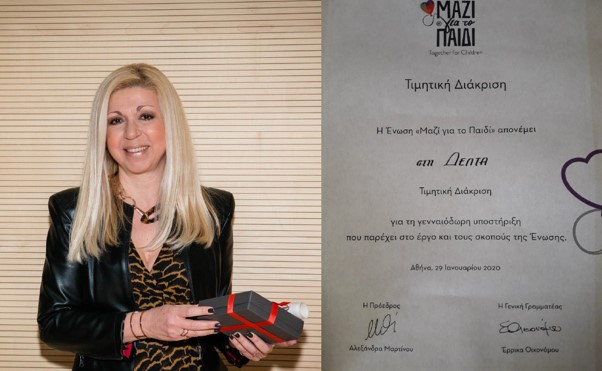 DELTA was awarded an honorary distinction by the “Together for Children” association for its continuous contribution to the association during the “Together for Children” award ceremony, which took place at the Benaki Museum. DELTA, in the framework of the corporate social responsibility actions, which has been continuously and consistently implementing for many years by supporting Greek families and giving priority to children, participated as a sponsor in the summer concerts of the association at the Odeon of Herodes Atticus in order to raise funds for the needs of children. In addition, DELTA offers, at every occasion, large quantities of its products to the children of the association, covering their basic nutritional needs, while the company’s employees voluntarily participate and support a multitude of activities designed to provide assistance to the association’s institutions. Mrs. Alexandra Vassilakopoulou, Corporate Communication Director, holding the award by “Together for Children” .