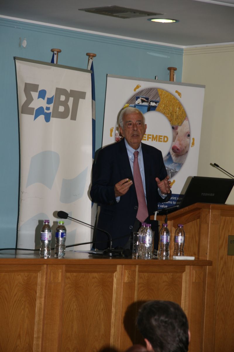 Στη συνέχεια της Ημερίδας έγινε εκτενής αναφορά στο ευρωπαϊκό έργο PEFMED. Καταρχήν, ο Δρ Θ. Μπαρτζάνας, Συντονιστής της Πλατφόρμας Αγρο-διατροφής της Γενικής Γραμματείας Έρευνας & Τεχνολογίας, μίλησε για τη σημασία των Βιώσιμων συστημάτων παραγωγής τροφίμων στη σύγχρονη εποχή και για τις επικείμενες χρηματοδοτούμενες δράσεις της ΓΓΕΤ, οι οποίες θα μπορούσαν να στηρίξουν σχετικές συνεργασίες ερευνητικών ιδρυμάτων και επιχειρήσεων. Στη συνέχεια τον λόγο πήρε η Δρ Φ. Σάλτα, Σύμβουλος Προγραμμάτων του ΣΕΒΤ, η οποία στα πλαίσια της παρουσίασης του ευρωπαϊκού έργου PEFMED μίλησε για την πρωτοβουλία της ΕΕ για τη «Δημιουργία μιας ενιαίας αγοράς για τα πράσινα προϊόντα», για τη  μέθοδο του Περιβαλλοντικού Αποτυπώματος του Προϊόντος (PEF) και τον κύριο στόχο του PEFMED, που είναι να δοκιμάσει τη μεθοδολογία του PEF σε συγκεκριμένα προϊόντα. Για την Ελλάδα, δοκιμή έγινε στη περιοχή της Θεσσαλίας και στο παραδοσιακό προϊόν Φέτα. Στο Περιβαλλοντικό αποτύπωμα της φέτας & την εμπειρία της ΔΕΛΤΑ ΤΡΟΦΙΜΑ ΑΕ, αναφέρθηκε η κα Ι. Μυλωνά, Υπεύθυνη Ελέγχου Διεργασιών & Ανάπτυξης Projects της Zώνης Γάλακτος από την εταιρεία ΔΕΛΤΑ ΤΡΟΦΙΜΑ ΑΕ τονίζοντας ότι η συμμετοχή τους συνέβαλε στη βαθύτερη κατανόηση της περιβαλλοντικής προσέγγισης της Ε.Ε. και αποτελεί οδηγό για την περιβαλλοντική βελτίωση της εταιρίας και της αλυσίδας αξιών. Η κα Α. Βατσανίδου, Επιστημονική Συνεργάτιδα του Εθνικού Κέντρου Έρευνας και Τεχνολογικής Ανάπτυξης (ΕΚΕΤΑ), που ήταν υπεύθυνο για την ανάλυση του κύκλου ζωής της φέτας μίλησε για τα κύρια αποτελέσματά της. Η πιλοτική αυτή δοκιμή αποτελεί την πρώτη απόπειρα εφαρμογής της μεθοδολογίας PEF στον ελληνικό αγροδιατροφικό τομέα και έδειξε ότι η παραγωγή ζωοτροφών και οι κτηνοτροφικές μονάδες συμβάλλουν ουσιαστικά στις περιβαλλοντικές επιπτώσεις του κύκλου ζωής της ΠΟΠ φέτας. Σημαντικό επίτευγμα αποτελεί η συμμετοχή και η συνεργασία ελληνικών γαλακτοκομικών εκμεταλλεύσεων και βιομηχανιών για την ολοκλήρωση της δοκιμής ενώ τη εμπειρία έδειξε ότι η Βιομηχανία παραγωγής γαλακτοκομικών προϊόντων θα μπορούσε να διαδραματίσει σημαντικό ρόλο στη βελτίωση της περιβαλλοντικής επίδοσης των προϊόντων με την εφαρμογή της μεθοδολογίας PEF για την εφοδιαστική της αλυσίδα, σε συνεργασία με τα υπόλοιπα ενδιαφερόμενα μέρη αυτής (κυρίως παραγωγοί ζωοτροφής και γαλακτοπαραγωγοί).
