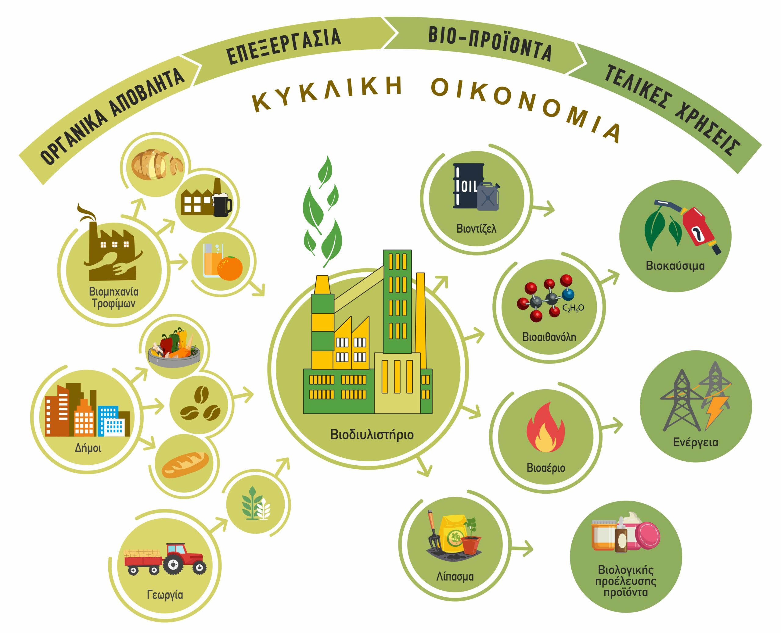 Με το σχεδιασμό, την ανάπτυξη και την επιδεικτική λειτουργία πρότυπου συστήματος βιοδιύλισης στο Τεχνολογικό Πολιτιστικό Πάρκο Λαυρίου, η βιομάζα θα αξιοποιείταιγια τη βιομετατροπή της σε μια σειρά προστιθέμενης αξίας προϊόντα όπως βιοντίζελ, βιοαιθανόλη, βιοαέριο και λίπασμα.