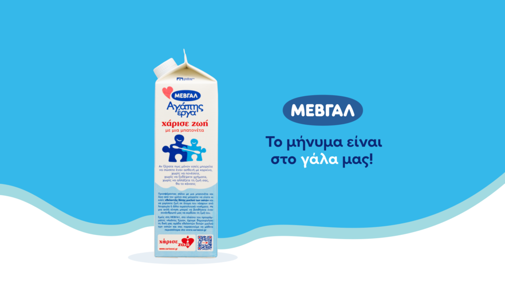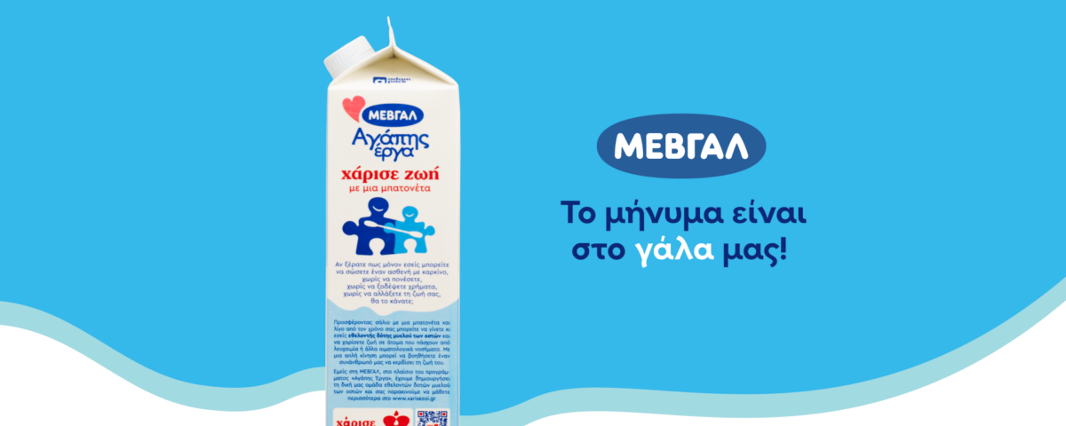 Ένα δυνατό κοινωνικό μήνυμα φτάνει στους καταναλωτές μέσω των νέων συσκευασιών φρέσκου γάλακτος ΜΕΒΓΑΛ. Η μία πλευρά της συσκευασίας είναι αφιερωμένη στο μήνυμα της οργάνωσης «Χάρισε Ζωή» και με κατανοητό λόγο εξηγεί πόσο εύκολο είναι να κερδίσουμε την ευκαιρία να σώσουμε έναν συνάνθρωπό μας κάνοντας απλά το τεστ της μπατονέτας.